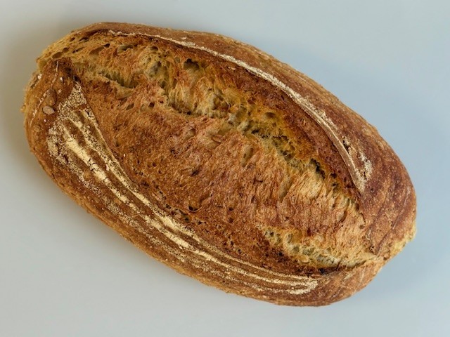 Vand, Fransk hvedemel (HVEDEMEL, HVEDEGLUTEN, melbehandlingsmiddel: E300, enzymer (HVEDE)), DURUM HVEDEMEL, HVEDEMEL, maltekstrakt (BYG), HAVREKLID, halvsigtet RUGMEL, salt tilsat jod, gær, ekstra jomfru olivenolie, økologisk maltekstrakt (økologisk BYGMALT, vand), HVEDEGLUTEN, emulgator: E472e, HVEDEMALTMEL, rapsolie, gurkemeje, melbehandlingsmiddel: E300, BYGMALTMEL, antiklumpningsmiddel: E535